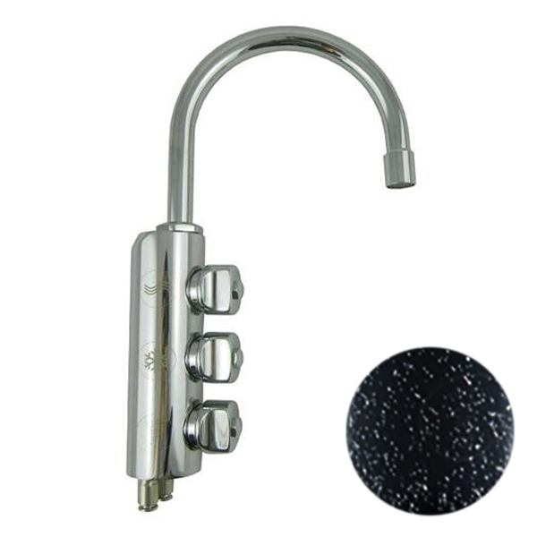 Rubinetto a 3 vie, con pomelli posti in verticale sul corpo del rubinetto e collo girevole da abbinarsi a refrigeratori con tre uscite, temperatura ambiente/fredda liscia/fredda gasata (Colore Granito Nero).
