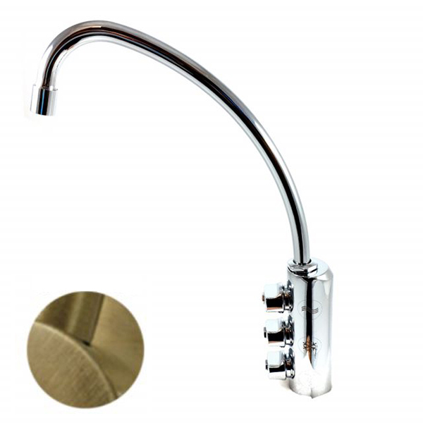 Rubinetto a 3 vie, con pomelli posti in verticale sul corpo del rubinetto e collo girevole da abbinarsi a refrigeratori con tre uscite, temperatura ambiente/fredda liscia/fredda gasata (Colore Bronzo Spazzolato).