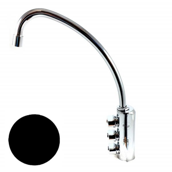Rubinetto a 3 vie, con pomelli posti in verticale sul corpo del rubinetto e collo girevole da abbinarsi a refrigeratori con tre uscite, temperatura ambiente/fredda liscia/fredda gasata (Colore Nero Lucido).